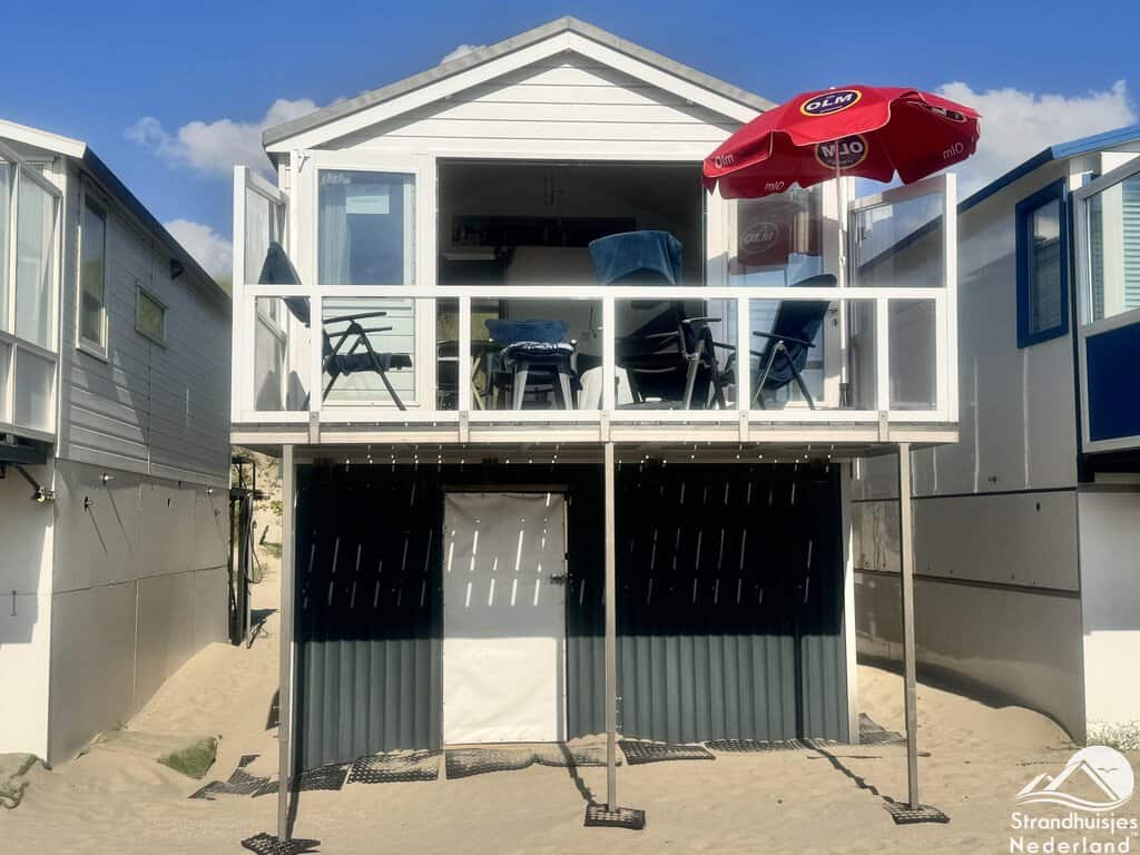 Het strandhuisje staat momenteel op de derde rij. Deze tweede en derde rij zijn hoger, zodat je over de voorste strandhuisjes heen kijkt. Het onderstel is 1,80 meter hoog. De ruimte onder het strandhuisje wordt vaak als opslag gebruikt voor bijvoorbeeld zonnebedden, speelgoed of surfboard.