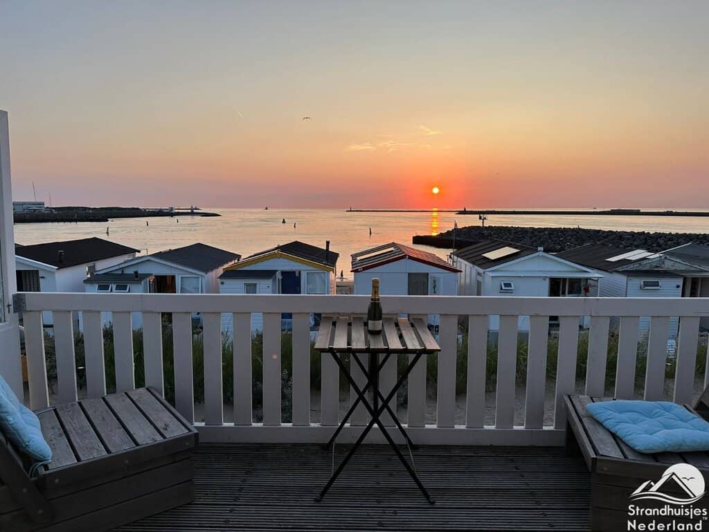 De openslaande deuren geven toegang tot het terras aan de zeezijde over de volle breedte van het strandhuisje.