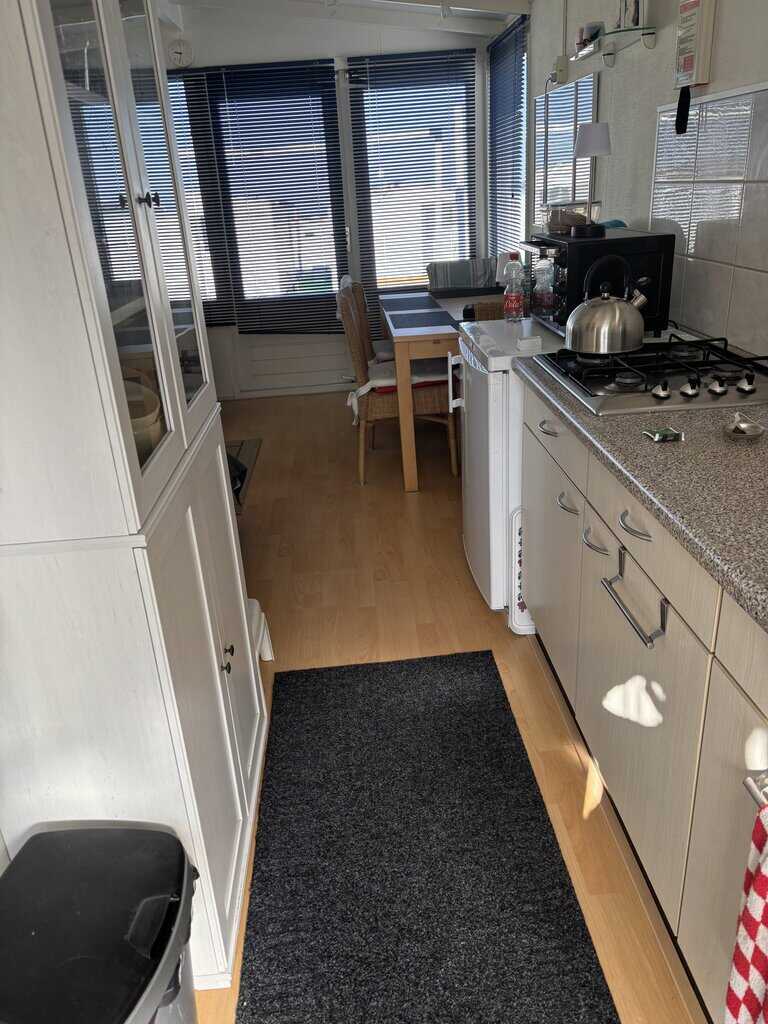 - Woonruimte met keuken voorzien van 4-pits gaskookplaat en koelkast met vriesvak